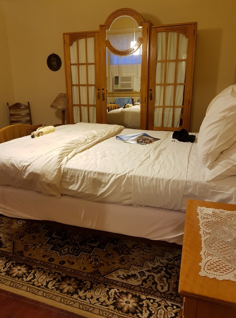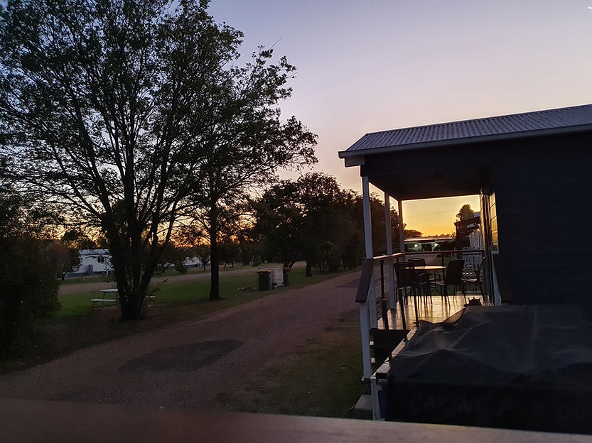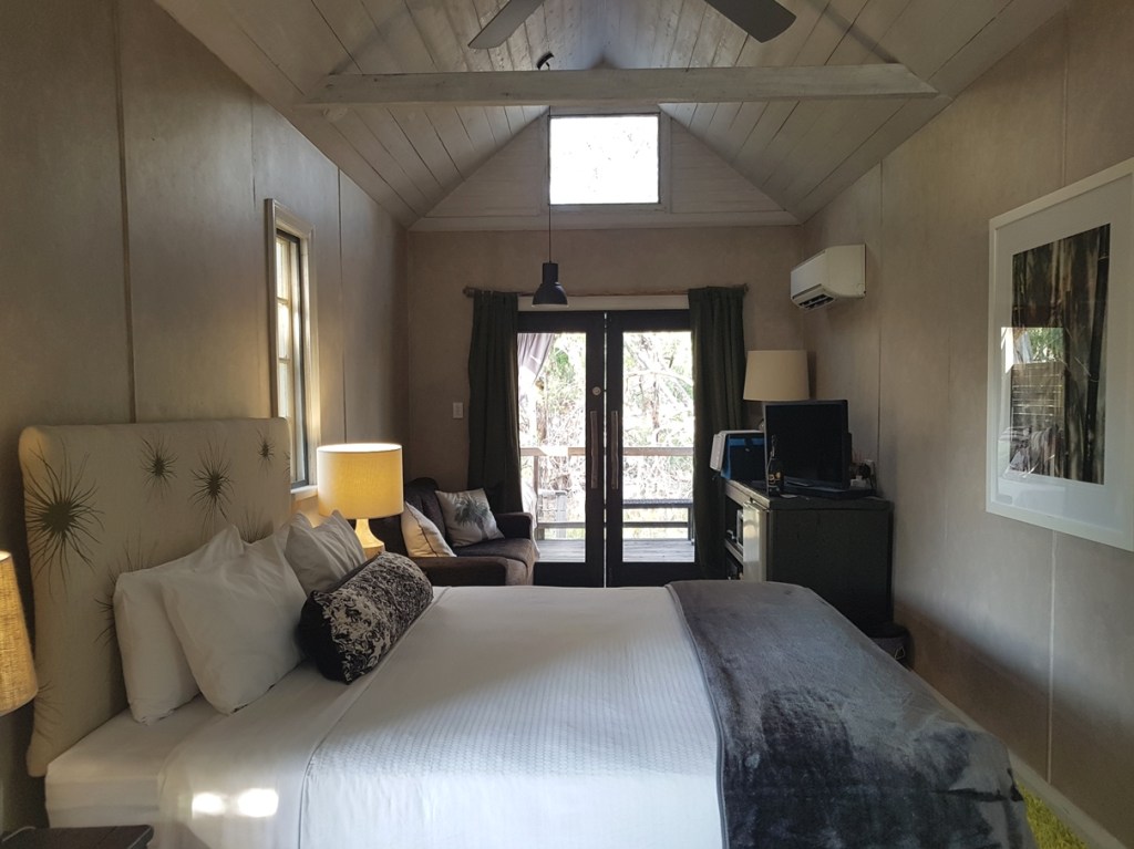 Our accommodation for the night is at the Pelican Rest Tourist Park in a Superior Queen Cabin, spacious and clean, with park-like grounds and pretty tree views from the verandah.