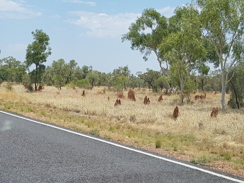 Termite mounds have started popping up on the road sides, the earth has turned a vibrant red and suddenly trees and grasses abound. We have left the parched channel country behind us.