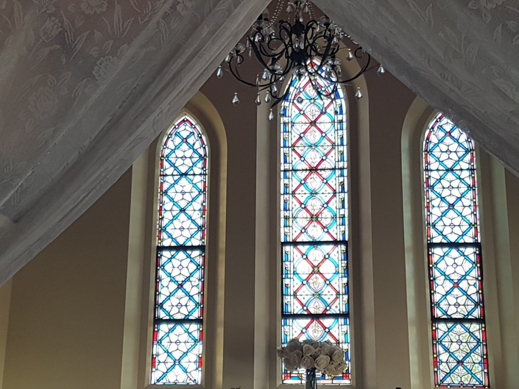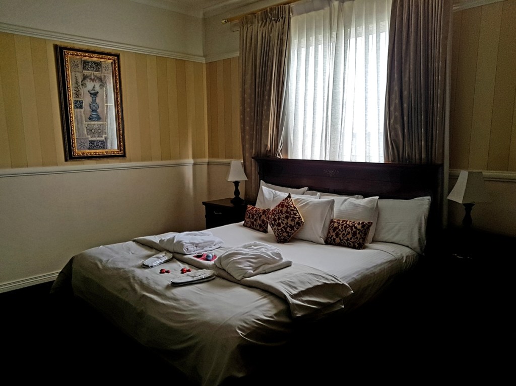 We are staying tonight in the Bavarian Suite, (originally the girls dormitory and then the Nuns’ Private Chapel), a beautifully appointed 5.5m x 10.7m ensuite room with 4 poster king bed, claw foot bath, private verandah, high vaulted ceilings, chandeliers and the original stained glass chapel windows.