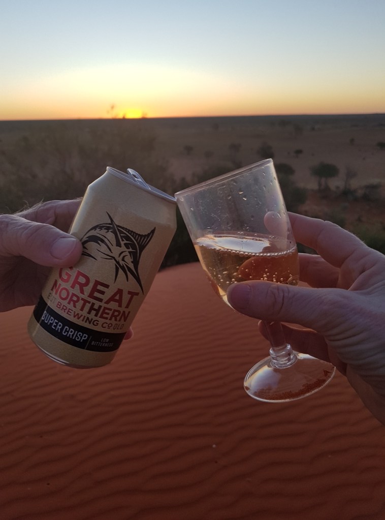 Needless to say, we don’t hang around, but head straight to our next pub…Pub #10 🍺 The Western Star (winner of the Best Outback Pub in Queensland) for a cooling ale and to mingle with the locals. We linger far too long over our beers though and realising the time, find ourselves racing to the sandhills just as the sun is sinking over the horizon. Panting and laughing, we awkwardly stumble up through the deep red sand and finally plonk down at the top, whip out the plastic cups and toast to a magnificent sunset from our magnificent vermillion perch. We also have the place entirely to ourselves! It is breathtaking and magical, and I’m so pleased we made the effort !!! ❤❤