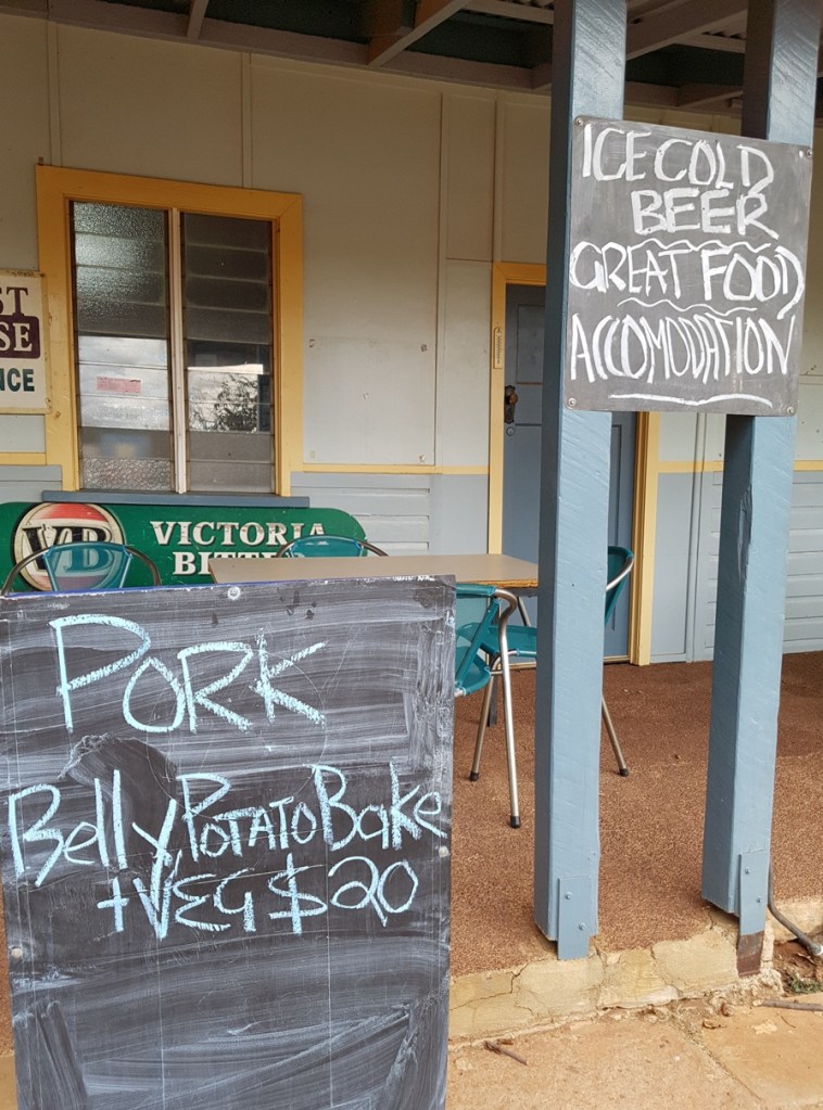 Instead we push on to Eulo (pop 48) and stay the night at Pub #12, 🍺 the infamous Eulo Queen Hotel. We check into our comfy cabin behind the pub and head to the bar where we down many cold beers while chatting to the publican. We get to know the locals while enjoying some well earned rain, and then head into the restaurant for a delicious Pork Belly and Potato Bake for dinner 🍝