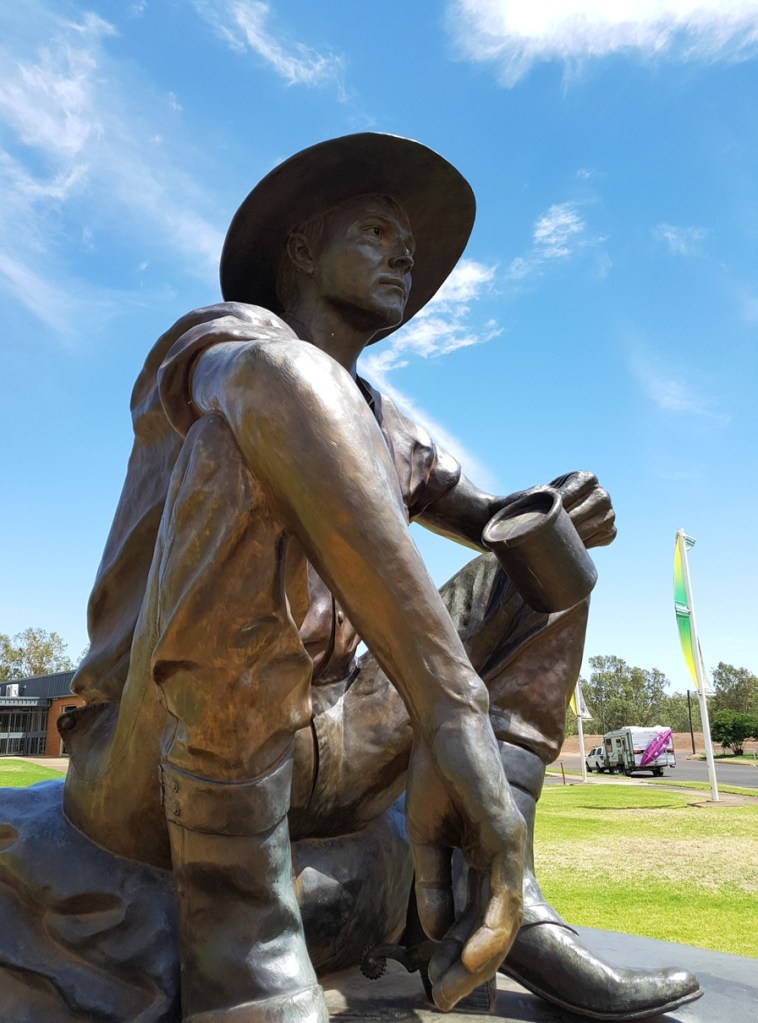 We don’t stop in Cunamulla for long, only for a stretch and to take a pic of the bronze statue of the Cunamulla Fella, (a tribute to Slim Dusty’s song about the stockmen of the bush).