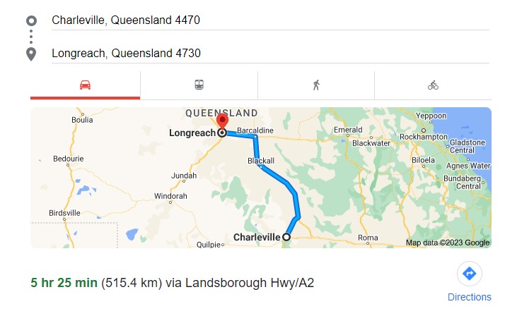 - Charleville to Longreach (515km – 5h 25m) via Augathella, Tambo, Blackall, Barcaldine and Ilfracombe