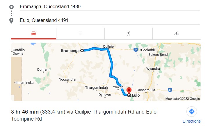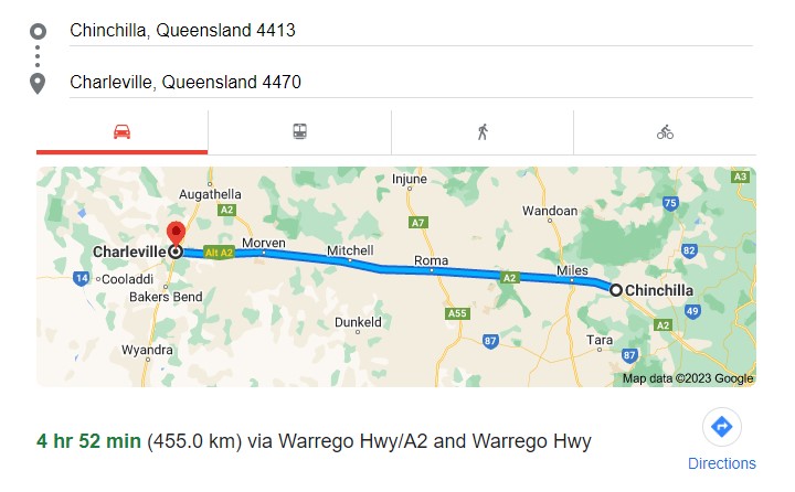- Chinchilla to Charleville (455km – 4hr 52m) via Roma and Mitchell
