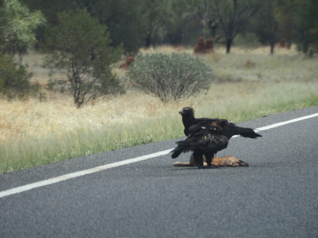 We see less roo carnage on the roadsides, but incredibly come upon two huge Wedge Tail Eagles feeding on a carcass on the road.