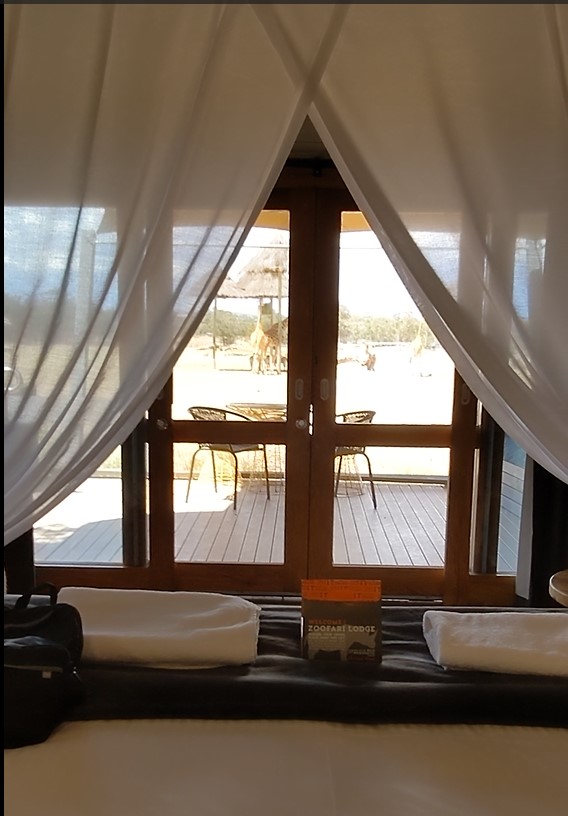 Our lodge boasts a decadent canopy bed, a huge bathroom with deep soaking bath, a mini bar, and a large viewing deck reminiscent of an African safari lodge. In fact, we are staying in what is called an ‘Animal View’ Zoofari Lodge, a name completely justified as soon as you set foot on its deck.