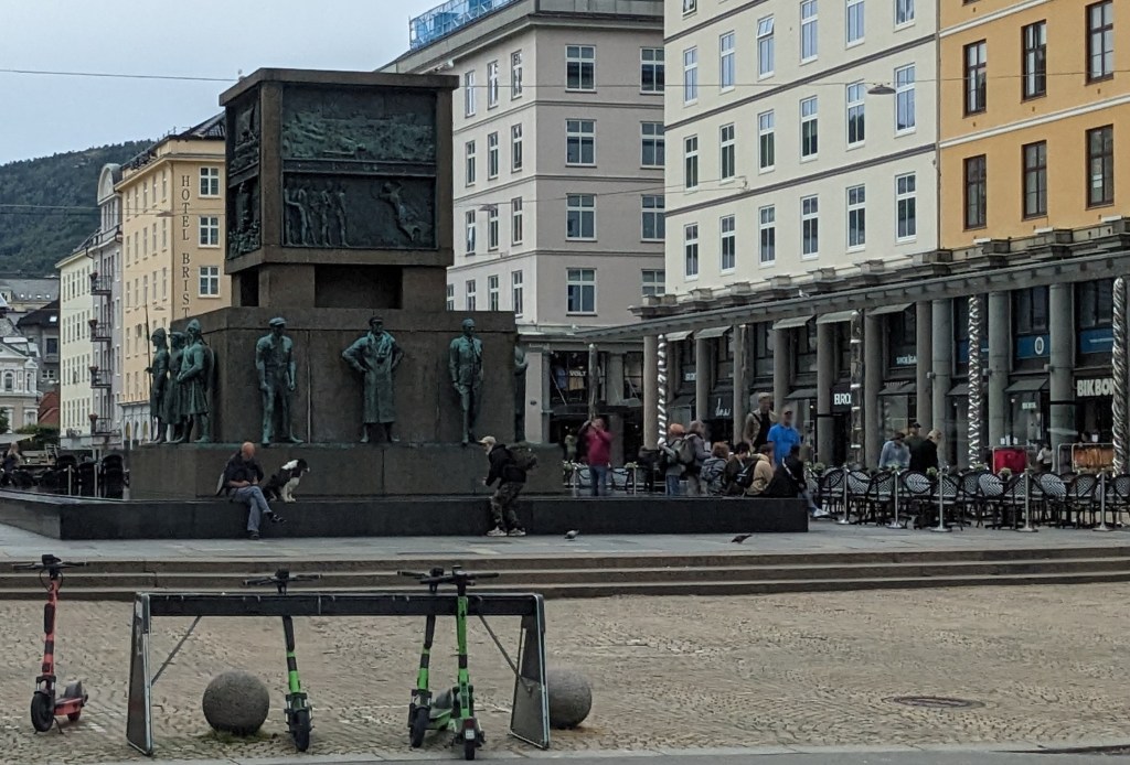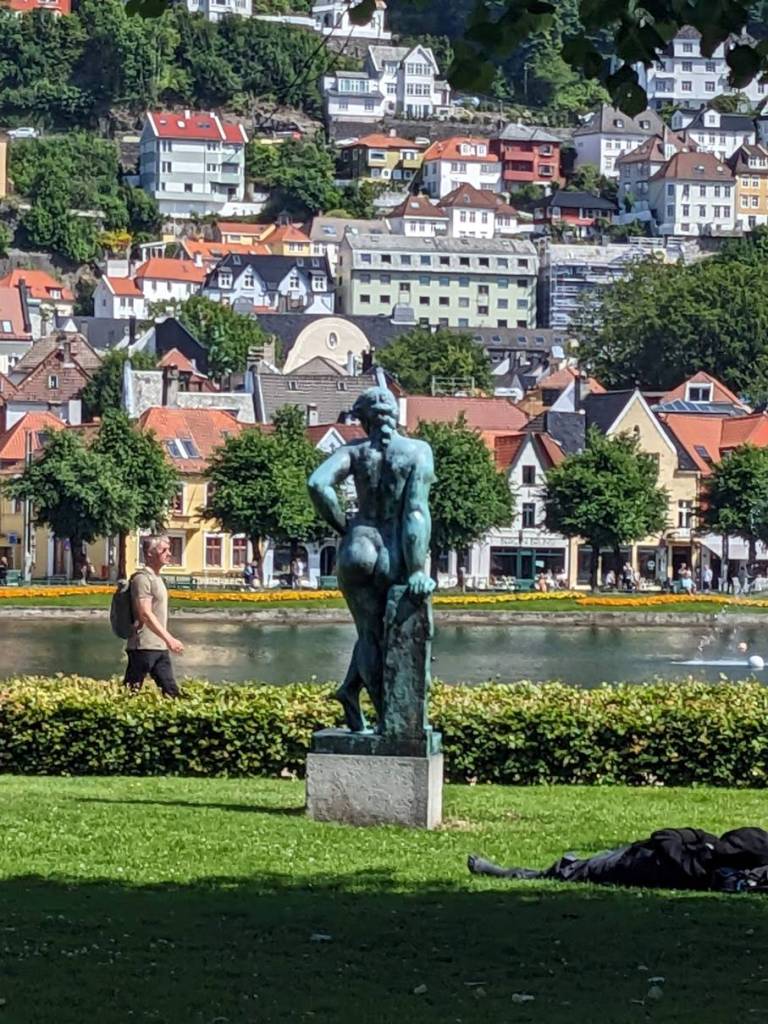 Our cultural appetite now completely satisfied, we wander along Torgallmenningen, an expansive pedestrian space in the heart of Bergen. Here people gather, shop and relax in the shade of the commanding Seafarers’ Monument. It’s a wide open space, originally built as a fire break in an effort to control those tenaciously regular fires that historically plagued Bergen and its tinder-timber structures.