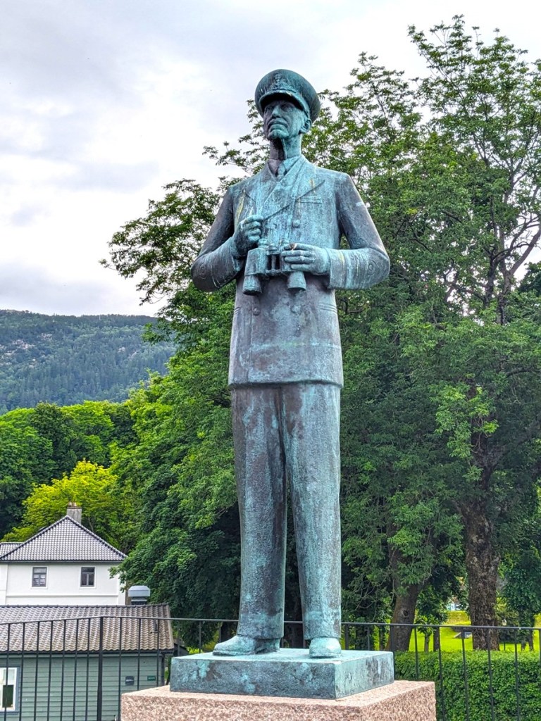On the sea front above a line of cannons, proudly stands a statue of King Haakon VII (1872-1957), binoculars in hand, always on guard and searching the port for enemy ships intent on attacking his beloved Norway. King Haakon is revered for his role in uniting Norway’s resistance to attack and to the five-year-long Nazi occupation during World War II. His statue perfectly represents his undying devotion to his believed homeland.