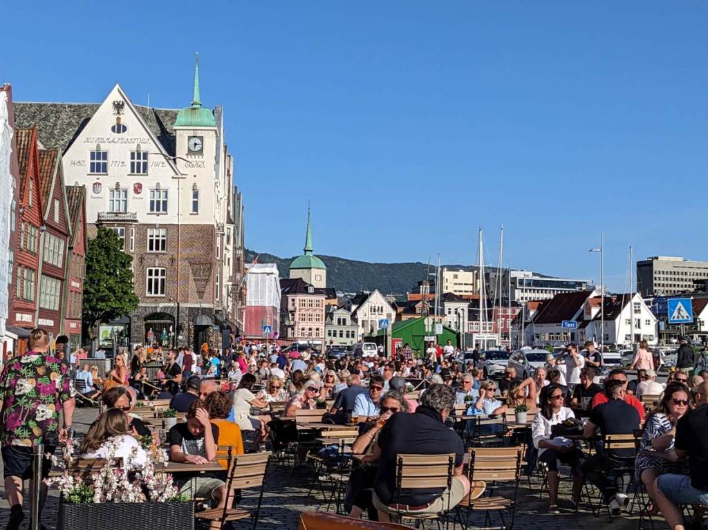 The masses are also settling in for the afternoon, congregating in Bryggen for sundowners on the cobblestones and a modern day midsummer party that goes on all night.