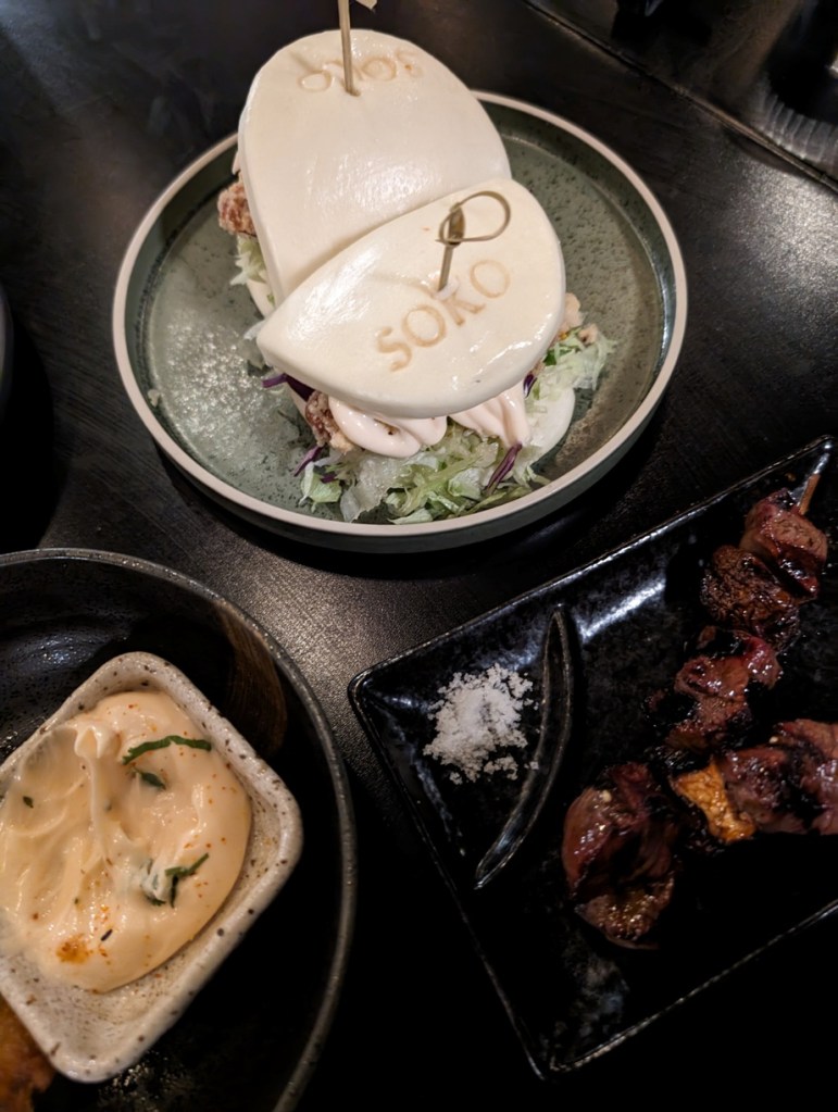 It’s an effort to drag your eyes from the twinkling city lights, but as you turn your back, the views and vibe on the rooftop itself are just as mesmerizing. There are people everywhere, at intimate tables for two sitting right up against the glass sides of the expansive deck, and groups of friends animatedly celebrating birthdays around tables decked out with floating, festive balloons. A central garden, lush and tropical, is brimming with trees and lights, and the vibrant, pulsating sounds of a jungle beat fill the air courtesy of SOKO’s Resident House DJs and Bongo Players.