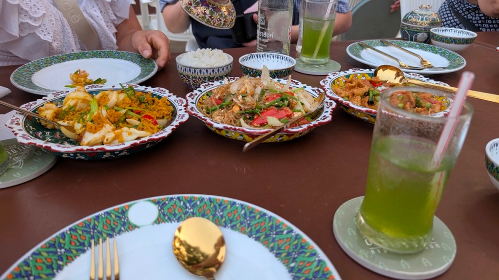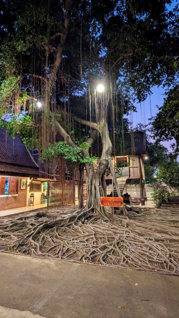 We return to our starting point and disembark onto the terrace of ‘Ayatthayarom Restaurant’. Here we are treated to a Thai banquet of delicate dishes both familiar and new. It is the perfect ending to a fulfilling and happy day of exploring. After, as we head back to the bus, we wander through the compounds of this delightful Thai establishment were tree roots spread out across the ground in an artistic fashion and shelves of pottery adorn the walls.