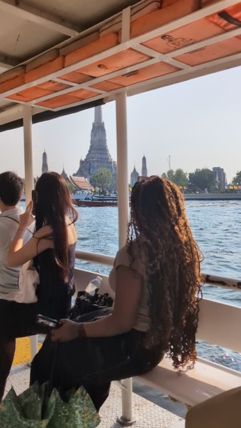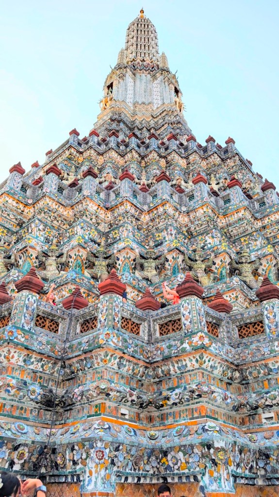 We are meeting our tour group at Tha Tian Pier which is just a 6 min walk from our hotel Riva Arun Bangkok. We meet our guide, Sun, and head off to the pier to catch a ferry across the river to Wat Arun, also called ‘Temple of Dawn’ (after the hindu god Aruṇa, often personified as the radiations of the rising sun). We have been admiring this striking temple from our hotel room and can’t wait to see it up close.