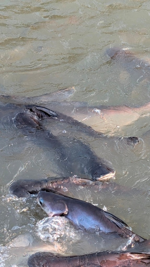 Next, as promised on the itinerary, we board a traditional Thai Boat and head down the Chao Phraya River as the sun begins to drop in a firey red ball towards the horizon. We are handed a long bread stick each and entertained by a Thai dancer adorned in silks, performing a traditional Thai dance. As she finishes her routine, we pull up at a pier and are immediately fish-bombed. They are everywhere, flapping and swirling in the river below us, vying for our meagre bread stick crumbs.