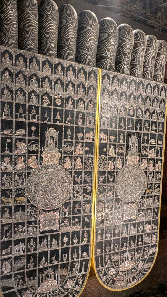 The right arm of the Buddha supports the head which rests on two box-pillows encrusted with glass mosaics, while the feet, with mother-of-pearl inlaid soles, 3 m high and 4.5 m long, are divided into 108 arranged panels, each displaying illustrations of auspicious ‘laksanas’ (characteristics) of the Buddha.
