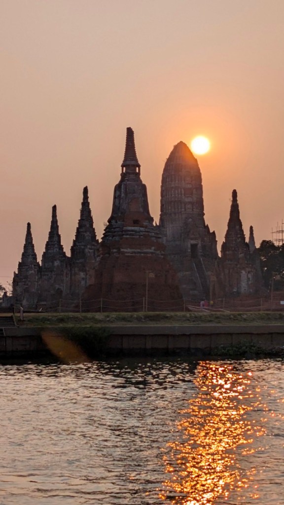 When our bread supplies are exhausted, as the sunset unfolds, the captain cuts the engine and we float about in front of Ayutthaya’s mystical ruins, taking photos as the sun sinks between the stupas in the background. What more could we ask for? Dinner perhaps?