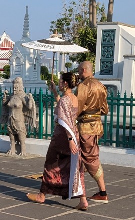 The ferry ride is a fun way to arrive, and with tickets sorted, we stroll into the temple grounds. The temple buildings on close inspection are beautiful, adorned with intricate porcelain and seashell mosaics, and everywhere we look we see people in Thai dress wandering around, having their photos taken. It is a touristy fad but it also adds to the the beauty and ambience of this place.