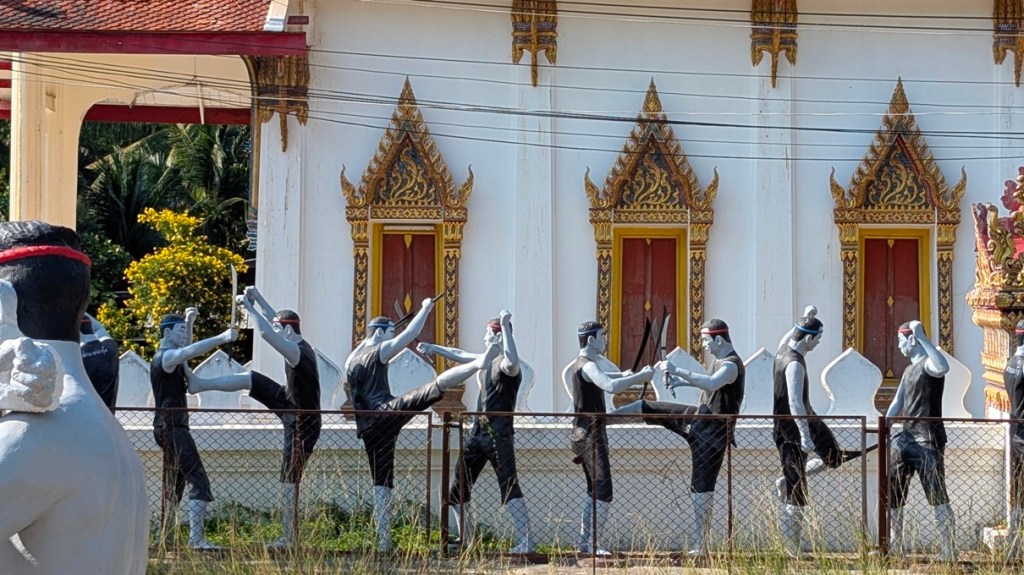 En-route, we take an interesting detour to discover Wat Bang Kung, a hidden temple embraced and consumed by Banyan tree roots! Continuing on from our exploration of Thai history at Ayutthaya, we find a shrine and statues inside honoring soldiers who defended Thailand in the 1800s, evoking that sense of history we are craving. Inside, also sits a golden Buddha image, where locals and visitors alike come to make offerings. The temple grounds feature memorials to King Taksin’s army, including life-size statues of warriors in combat – an arresting sight.