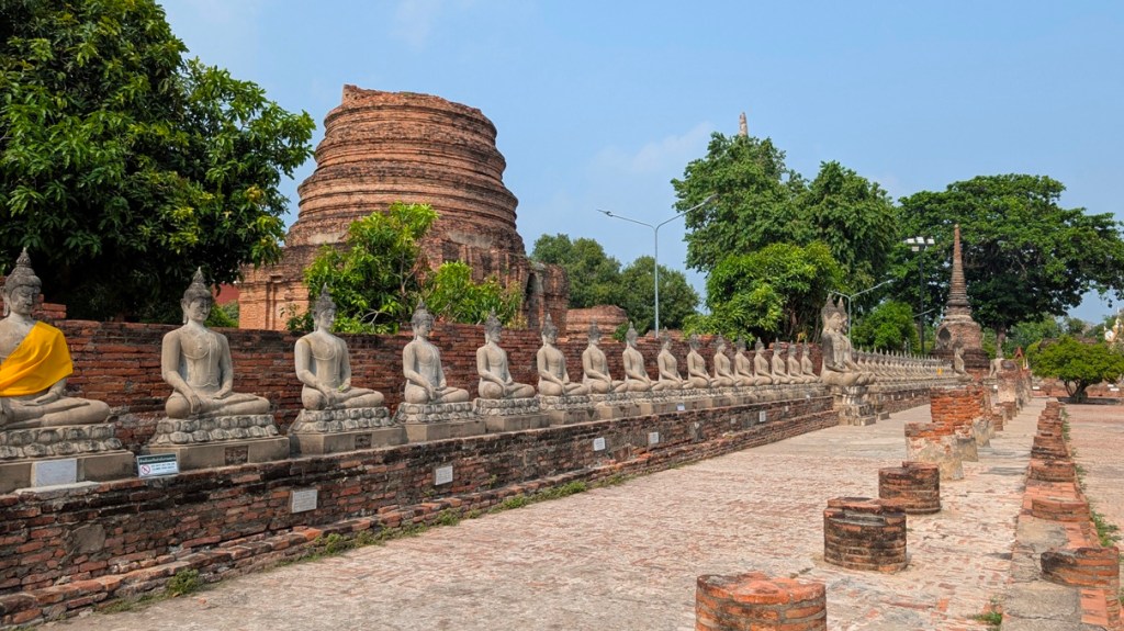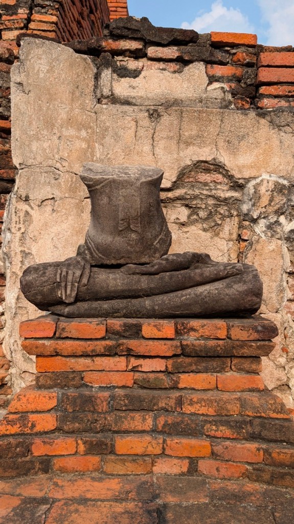 Our next stop is at Wat Maha That, a historic Buddhist temple located in Ayutthaya, dating back to the 14th century. I am excited to visit this temple just to see its renowned, iconic Buddha head entwined in the roots of a banyan tree. But the temple ruins themselves are just as enticing, their red brick layers and scattered headless Buddha statues are a reflection of the grandeur of the ancient Ayutthaya Kingdom.